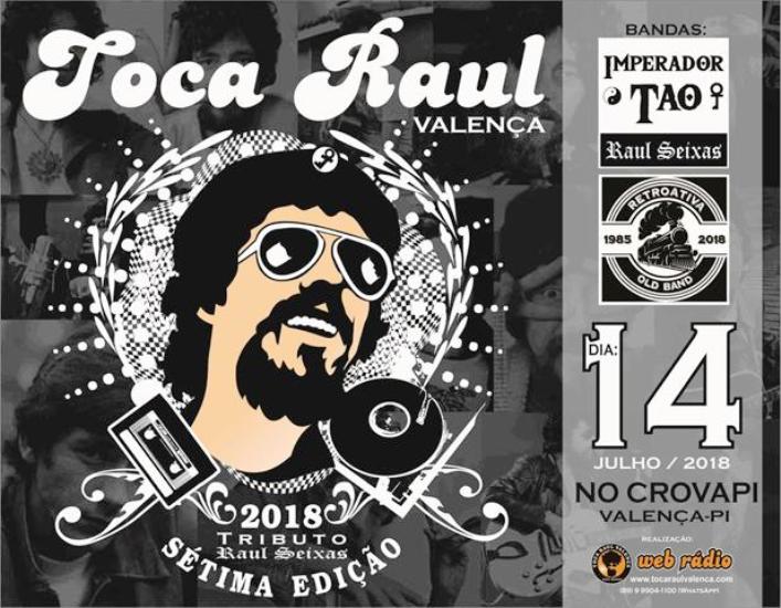 Sucessos do cantor e compositor baiano Raul Seixas serão lembrados na 7ª edição do 'Toca Raul' em um show tributo no sábado, dia 14 de julho, no Crovapi Clube no Centro, em Valença do Piauí. A apresentação ficará por conta das bandas Retroativa de Água Branca e Imperador Tao de Teresina, que sobem ao palco a partir das 22h30.